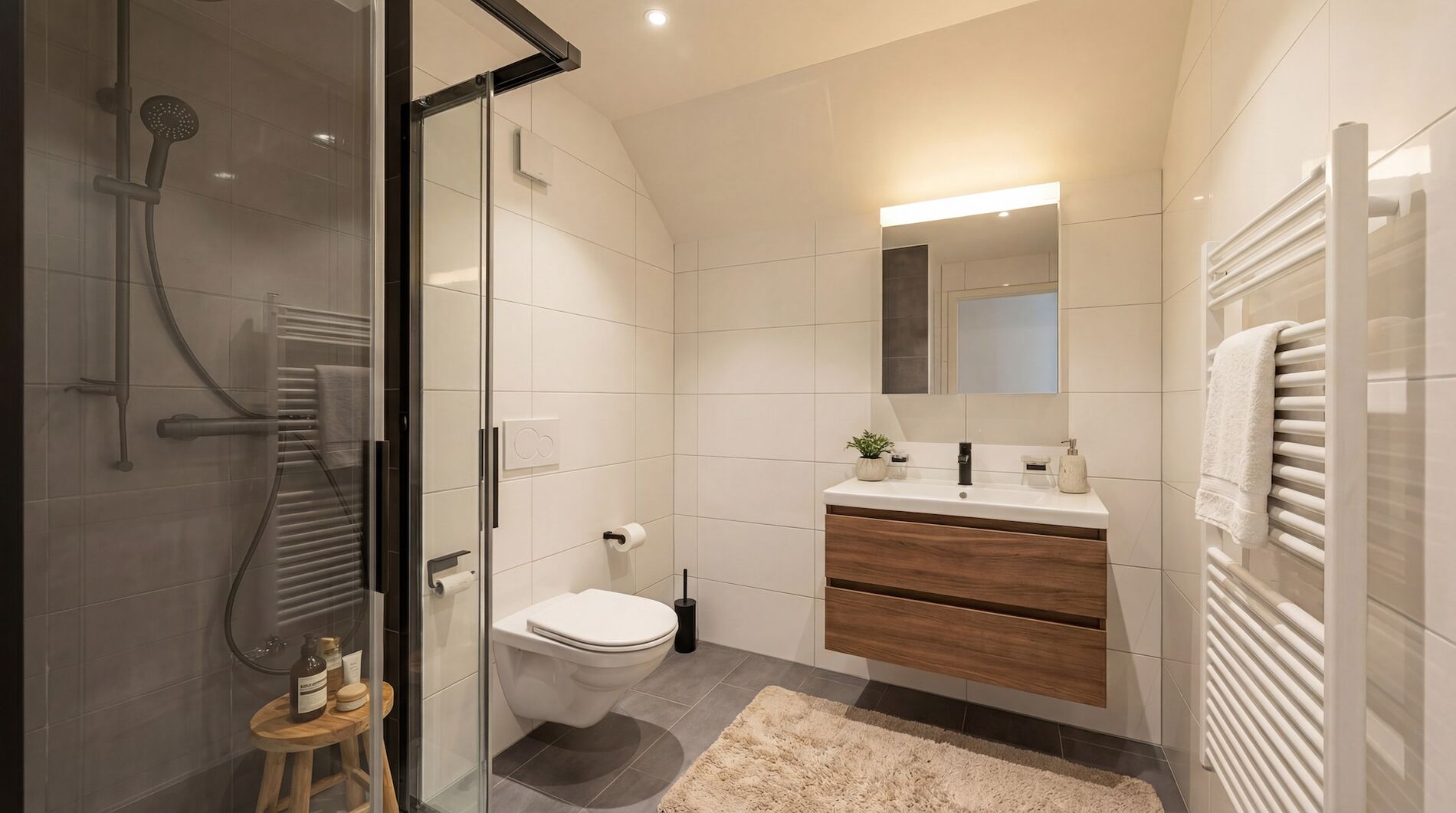 La chambre, spacieuse et raffinée, bénéficie d’un environnement calme et chaleureux. Une salle de douche contemporaine, équipée d’une colonne de lavage, complète ce bien avec sobriété et fonctionnalité.
