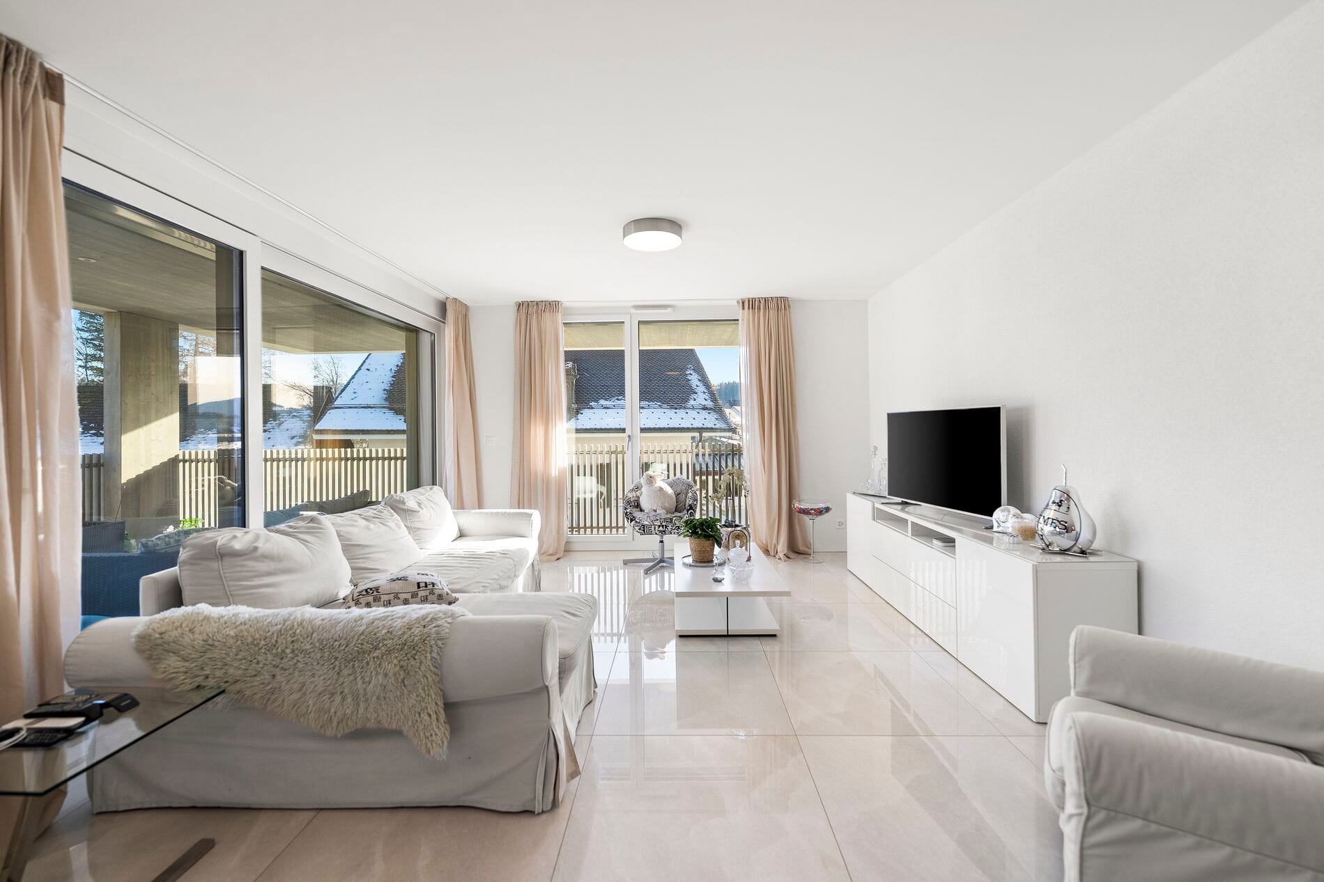 Implanté dans une nouvelle construction certifiée Minergie, l’appartement se distingue par des finitions très soignées et un confort de haut niveau. Il offre trois belles chambres à coucher, dont une suite parentale avec salle de bain privative, ainsi qu’un réduit aménagé en buanderie privative, apportant une réelle praticité au quotidien. Les espaces de vie profitent d’une luminosité exceptionnelle grâce aux grandes baies vitrées, s’ouvrant sur une élégante loggia avec vue champêtre dégagée, véritable prolongement de l’espace intérieur.