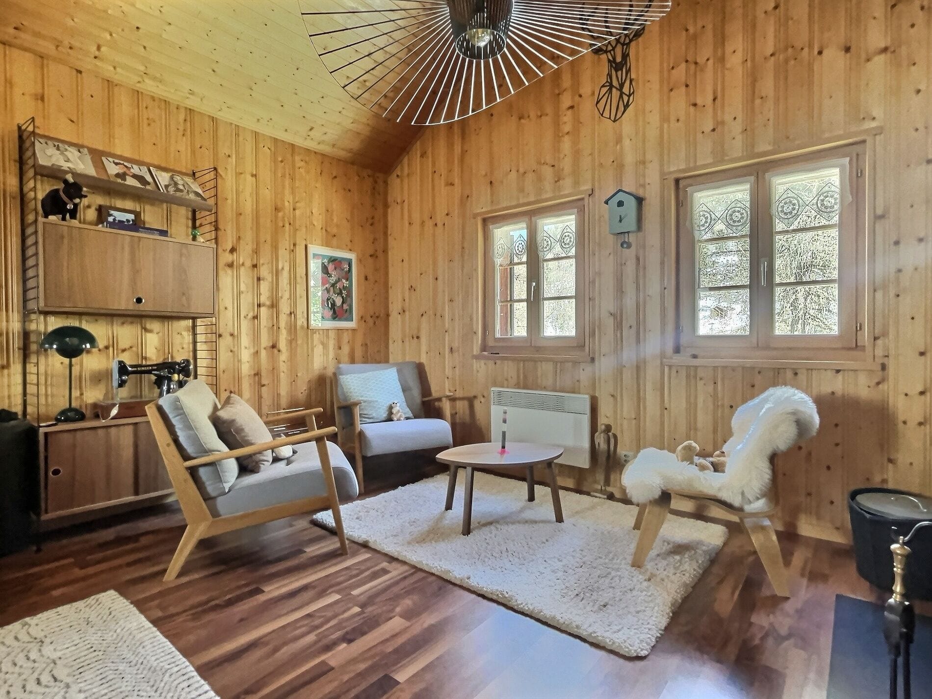 Salon cosy avec poêle suédois, mis en valeur par un mur en véritable pierre.
