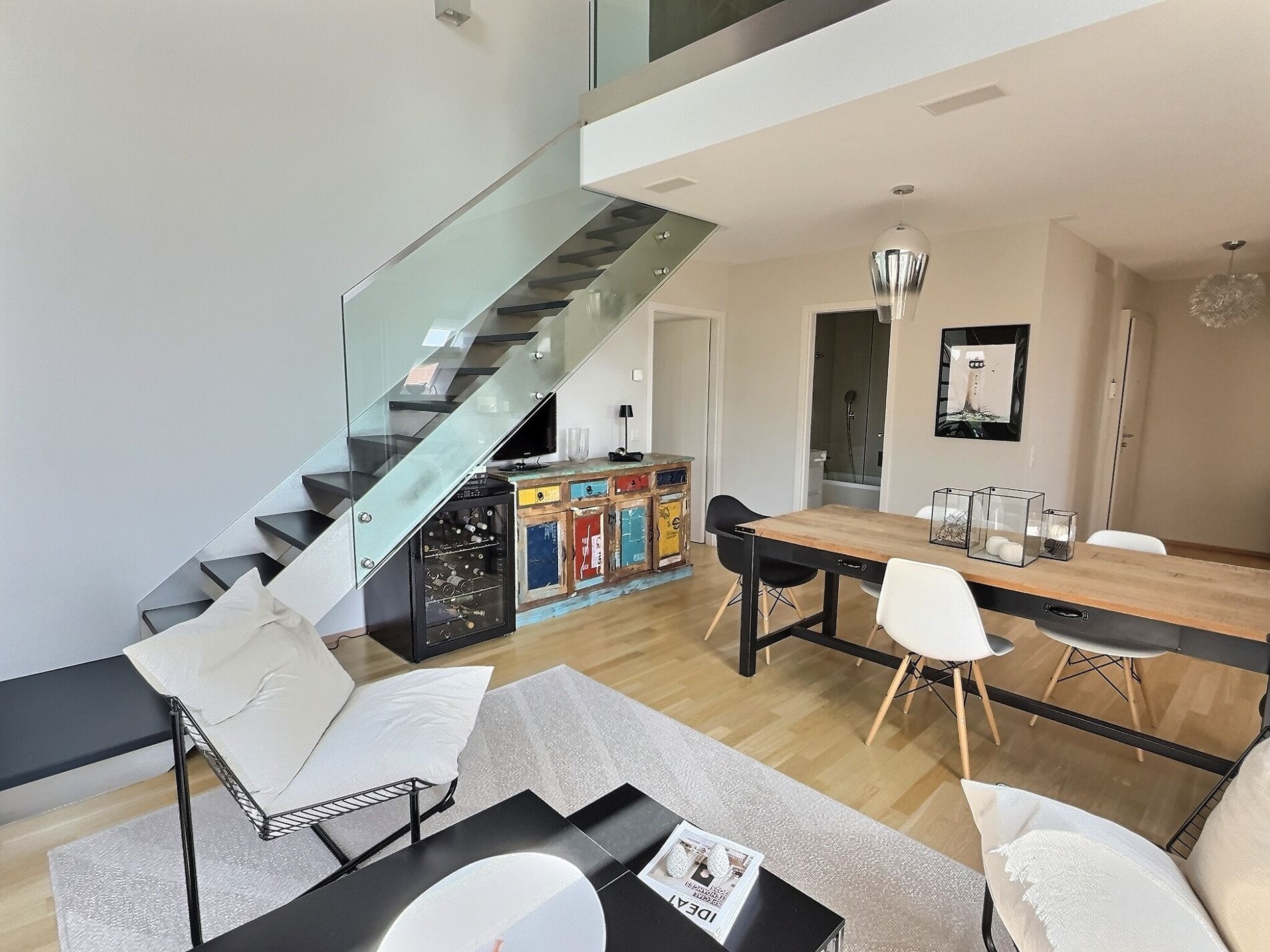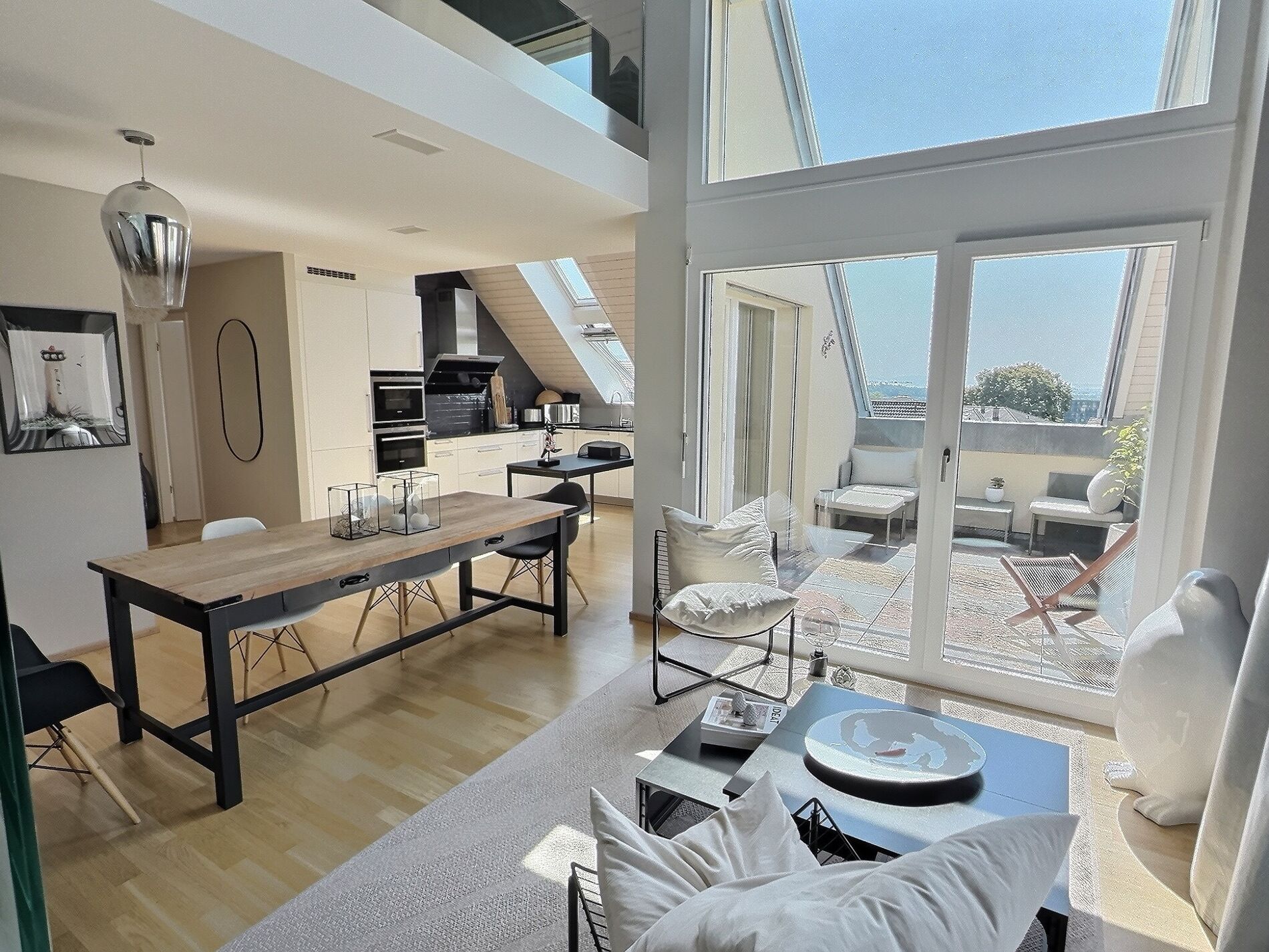 Le salon, ouvert sur le coin repas et la cuisine, jouit d’une importante luminosité grâce à toutes ses ouvertures vers l’extérieure. Il est surplombé par une mezzanine ouverte qui pourrait très facilement être fermée – grâce à un sanitaire en son étage, cet espace pourrait devenir une chambre séparée. Cet appartement bénéficie également de deux chambres à coucher dont une en suite avec sa propre salle de douche et dressing. Une salle de bains supplémentaire complète les parties sanitaires.