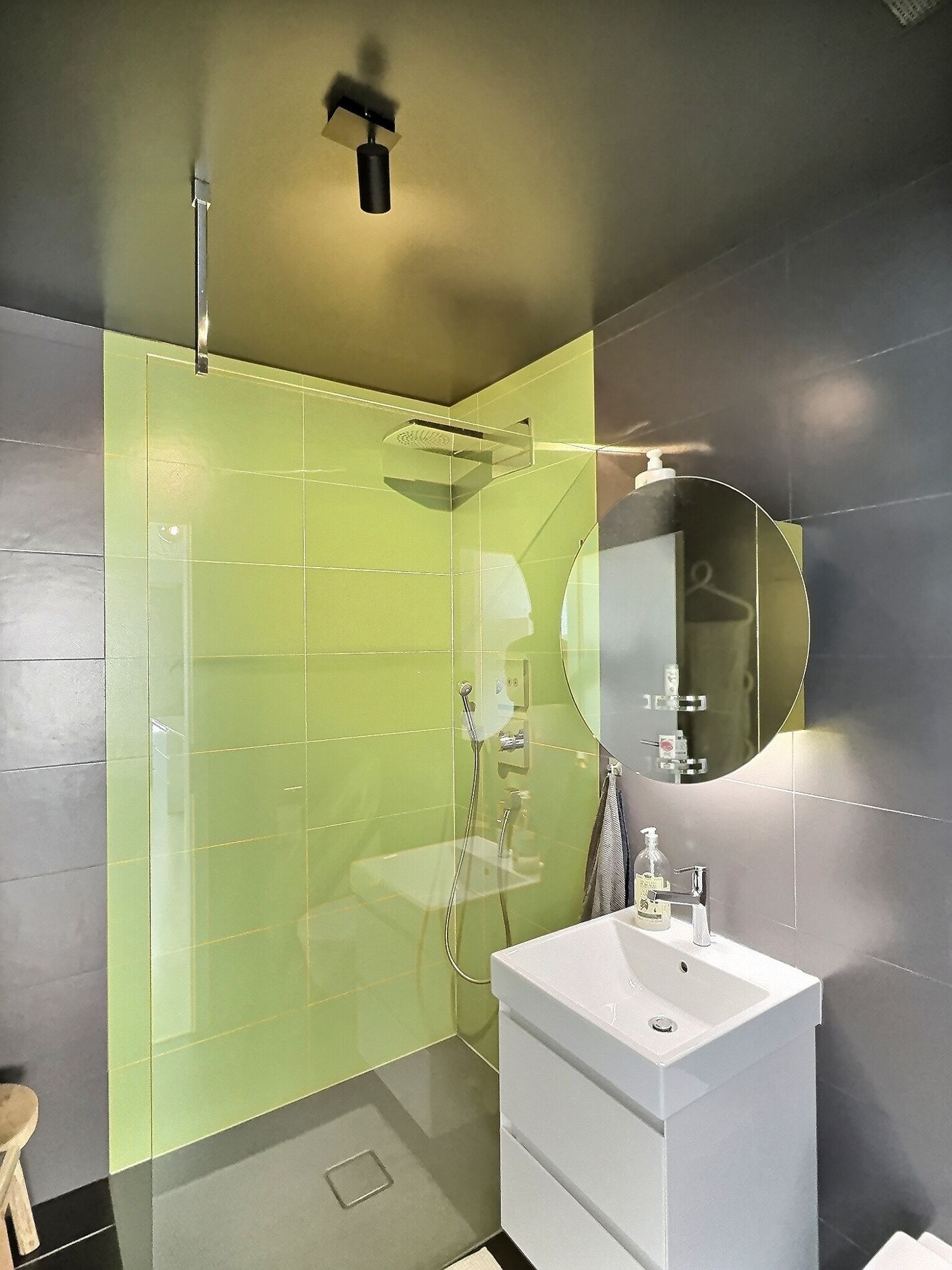 Un balcon négatif ouvert au Sud et à l’Ouest, avec avec toiles de tente pour gagner en confort, devient un espace complémentaire pour recevoir aussi bien l’été que pour des périodes un peu moins estivales.
