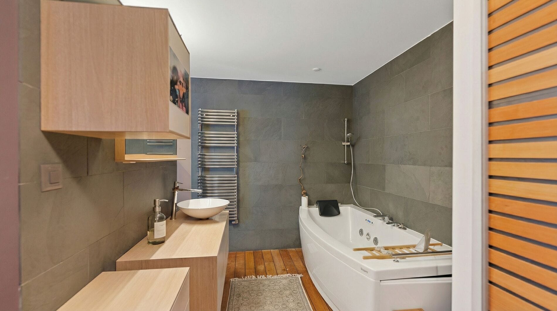 L’appartement dispose de quatre chambres, dont une vraie suite parentale avec salle de bains équipée d’un bain à bulle et d’une douche à jets, véritable havre de bien-être.