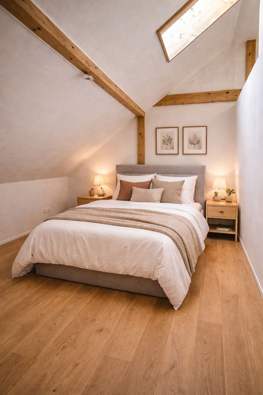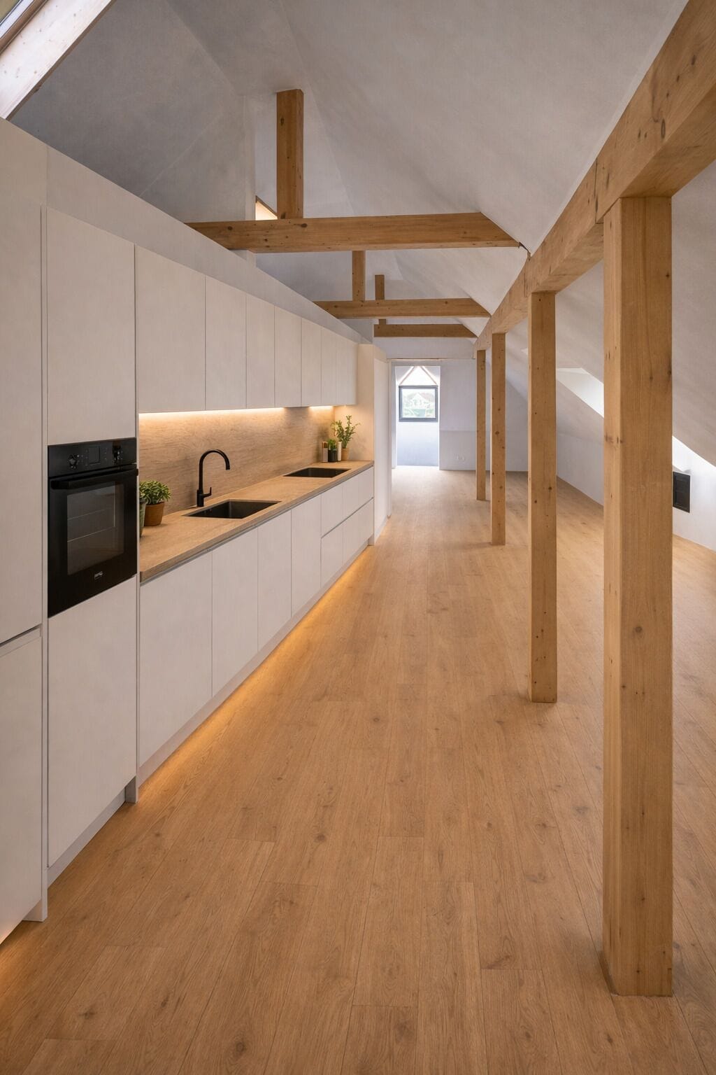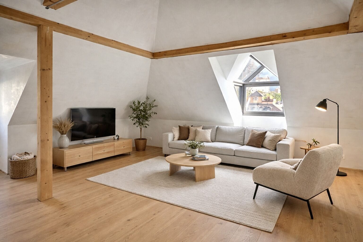 Situé au troisième et dernier étage d’un bâtiment historique et entièrement rénové, il vous émerveillera par ses grands volumes et le charme qu’offrent des poutres apparentes.