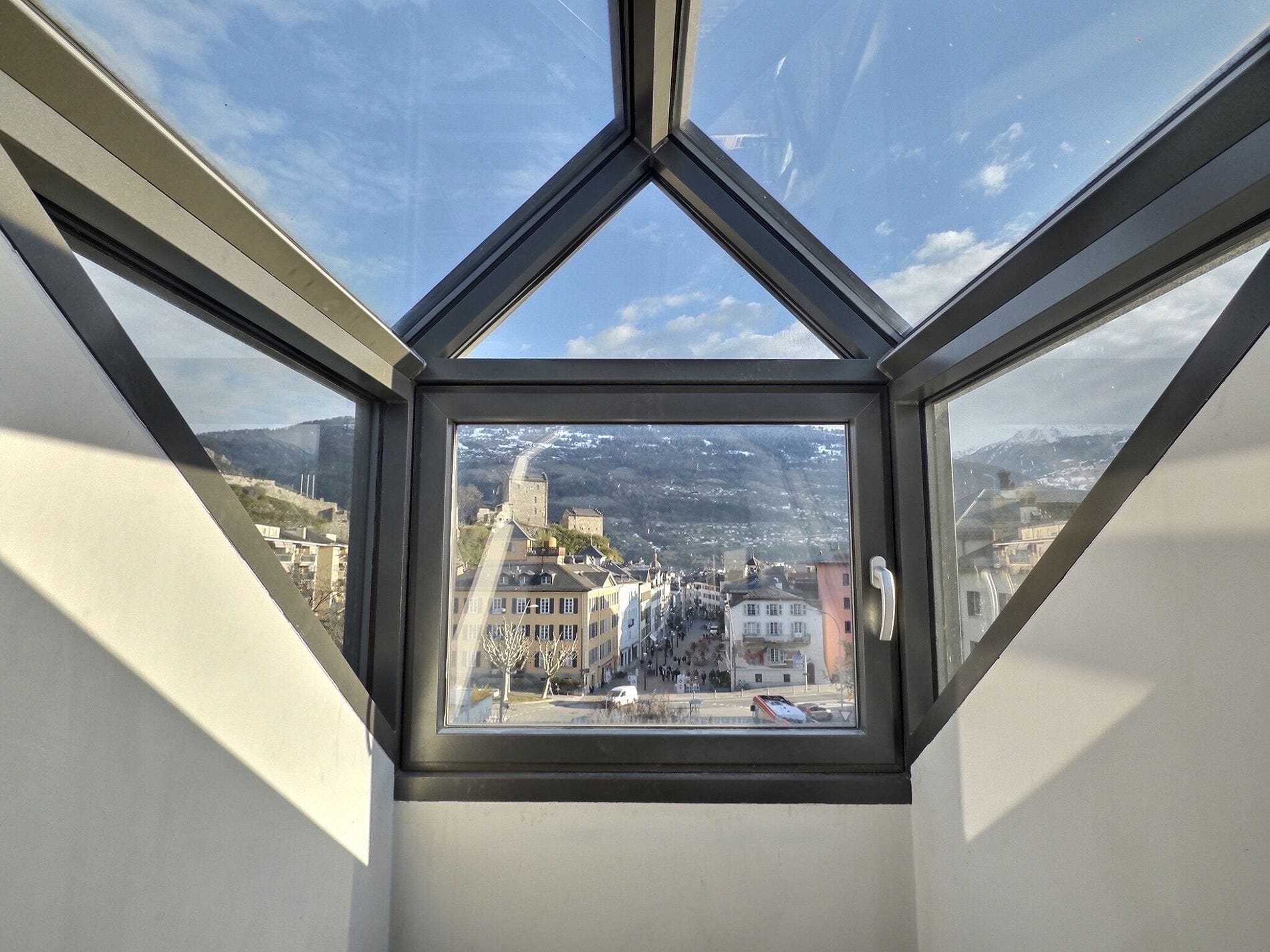 Surplombant la ville de Sion et ses emblématiques Châteaux, voici un spectaculaire et lumineux appartement type loft en attique avec un ascenseur direct.