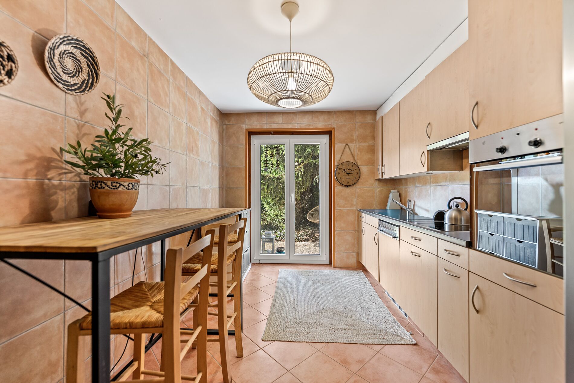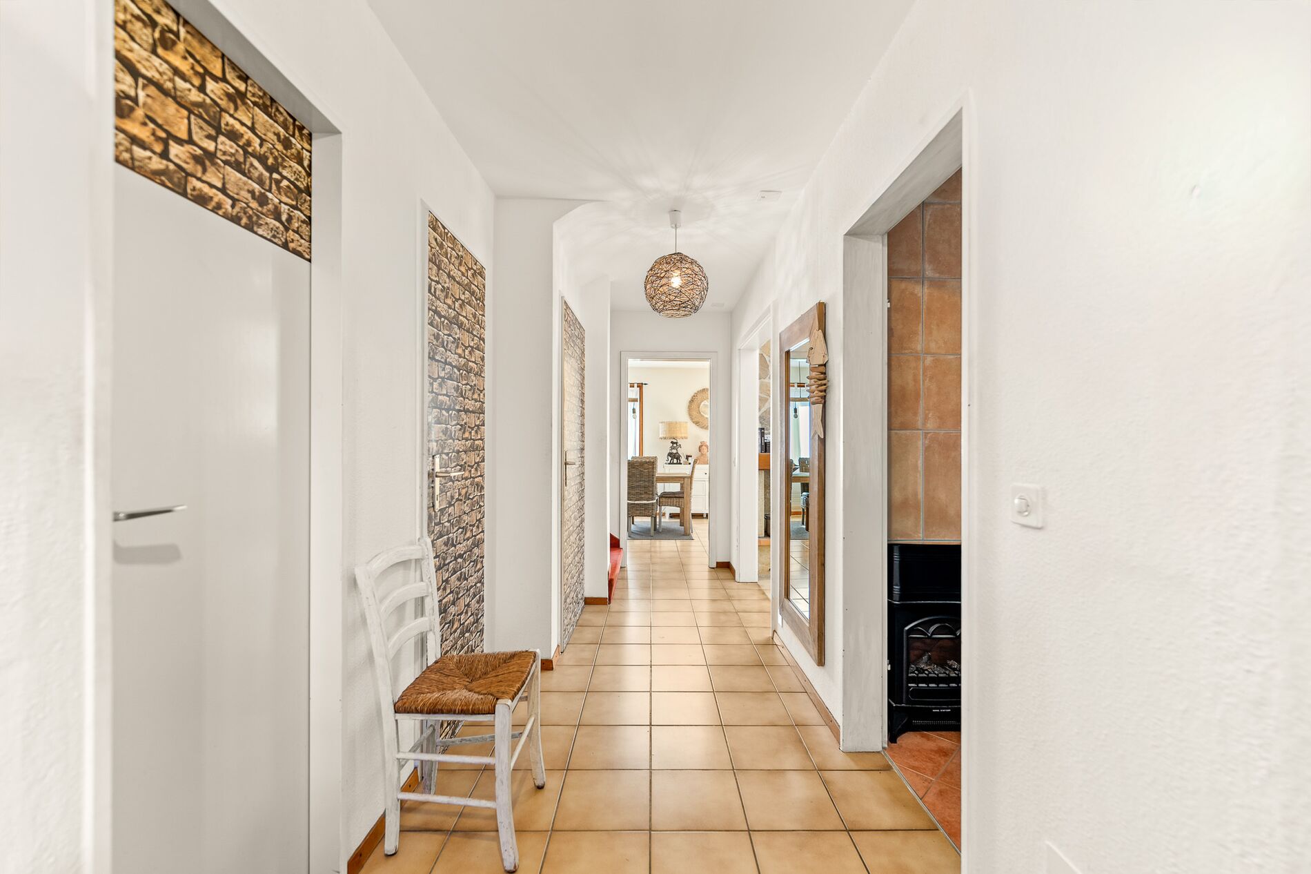 La maison se distribue de manière fonctionnelle et harmonieuse. Au rez-de-chaussée, une cuisine habitable permet de profiter pleinement du quotidien grâce à son accès direct vers l’extérieur et le jardin. Le vaste séjour et la salle à manger séduisent par leurs beaux volumes et leur luminosité. Une cheminée disposée en son centre apporte une atmosphère chaleureuse et conviviale à cet espace de vie. Ce niveau comprend également un réduit pratique ainsi qu’une salle de douche avec WC.