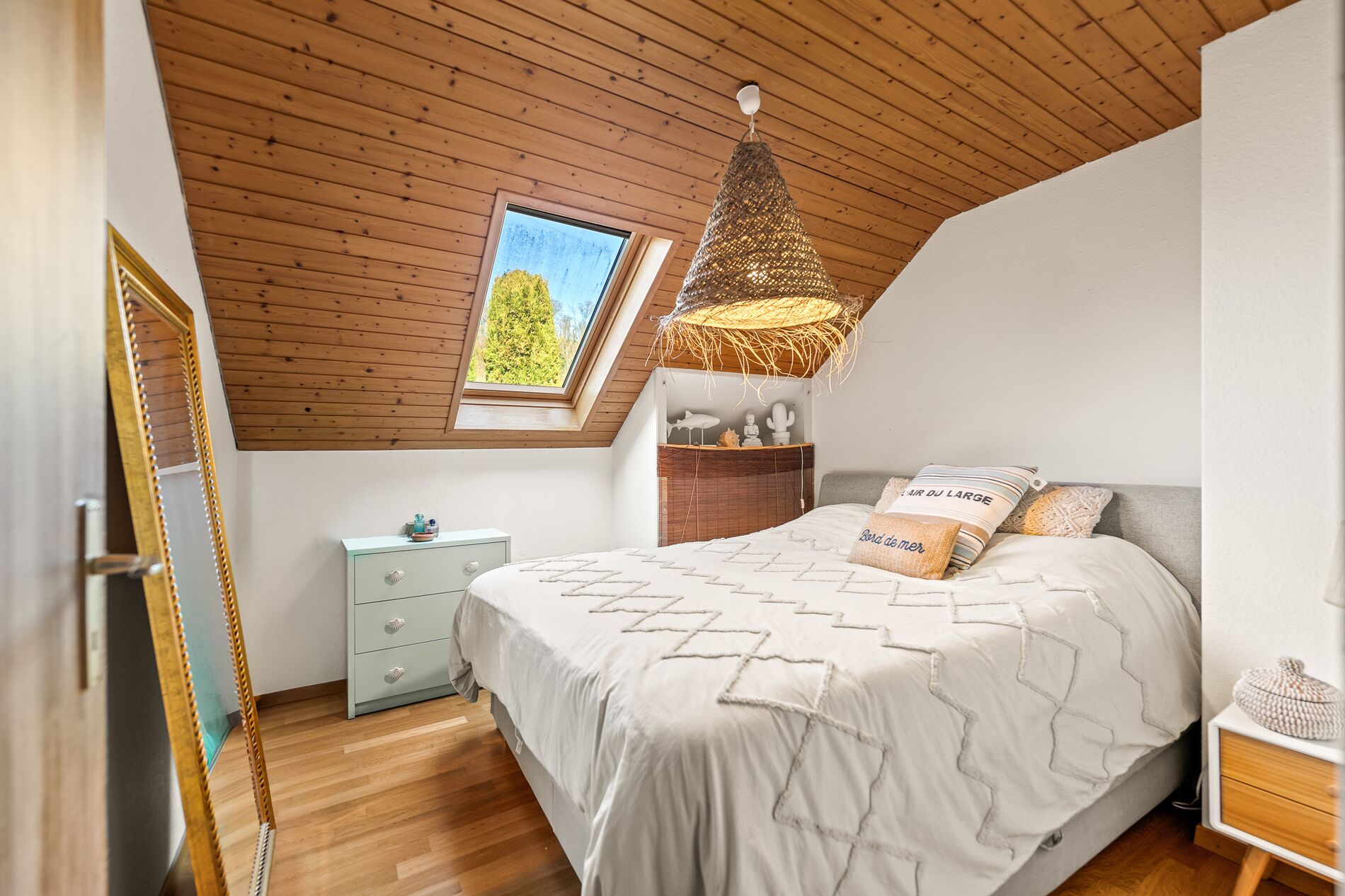 À l’étage, la partie nuit propose quatre chambres à coucher, dont deux disposent d’armoires encastrées. Une salle de bains dessert cet étage, assurant confort et fonctionnalité pour une vie de famille.