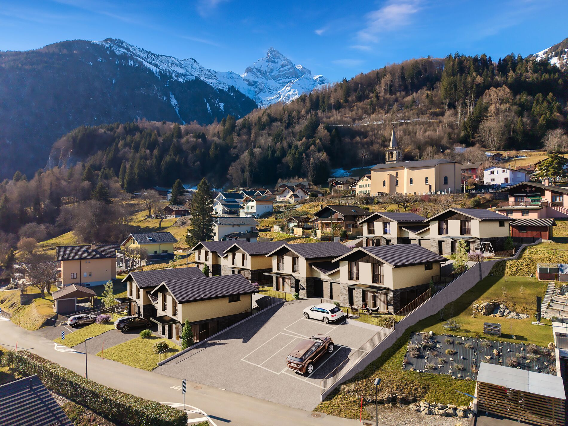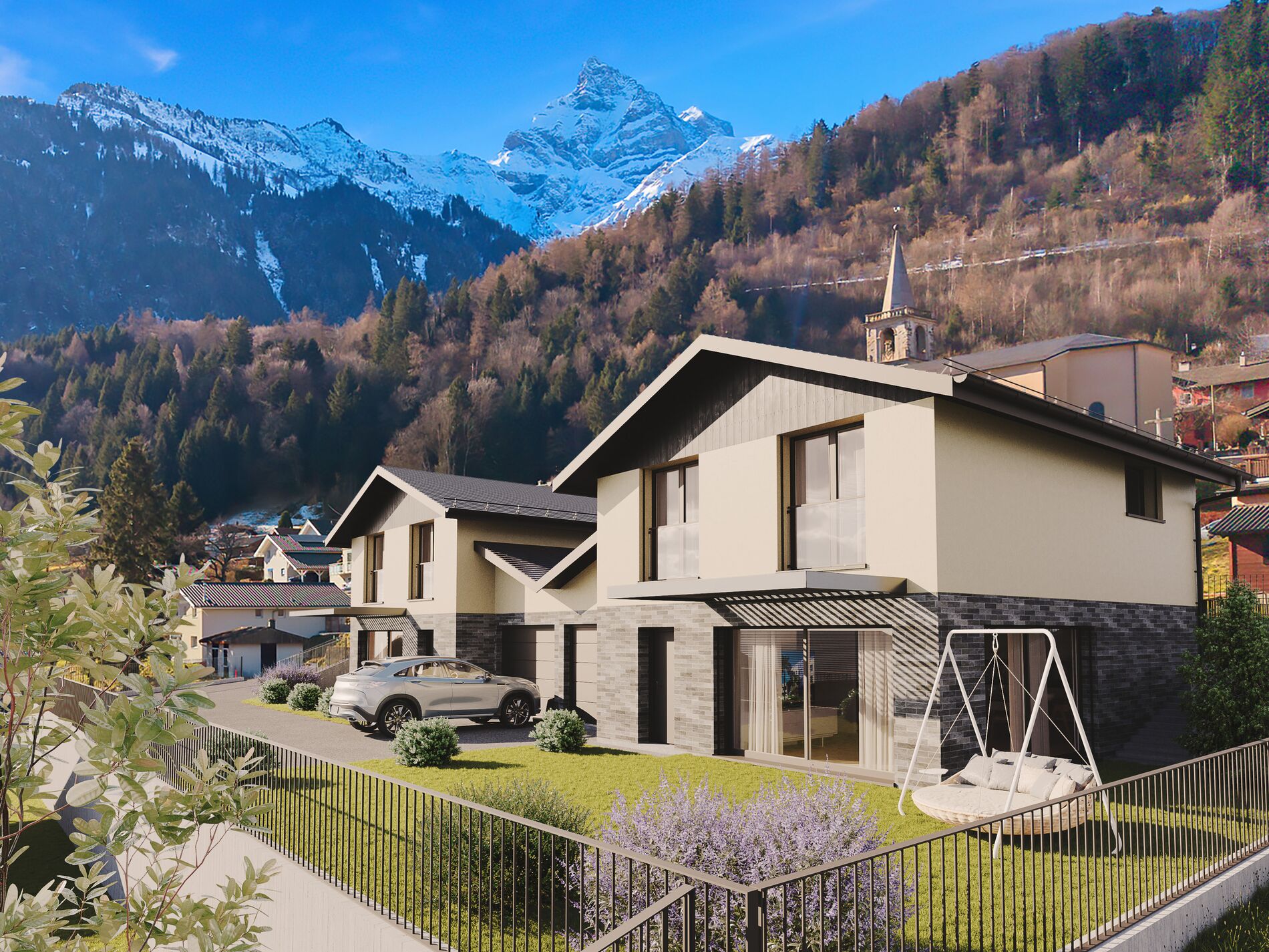Le projet se compose de 8 villas contemporaines jumelées par le garage, conçues pour offrir confort, luminosité et intimité. Chaque villa dispose d’une agréable terrasse et d’un jardin privatif, parfaits pour profiter pleinement du panorama et des beaux jours.