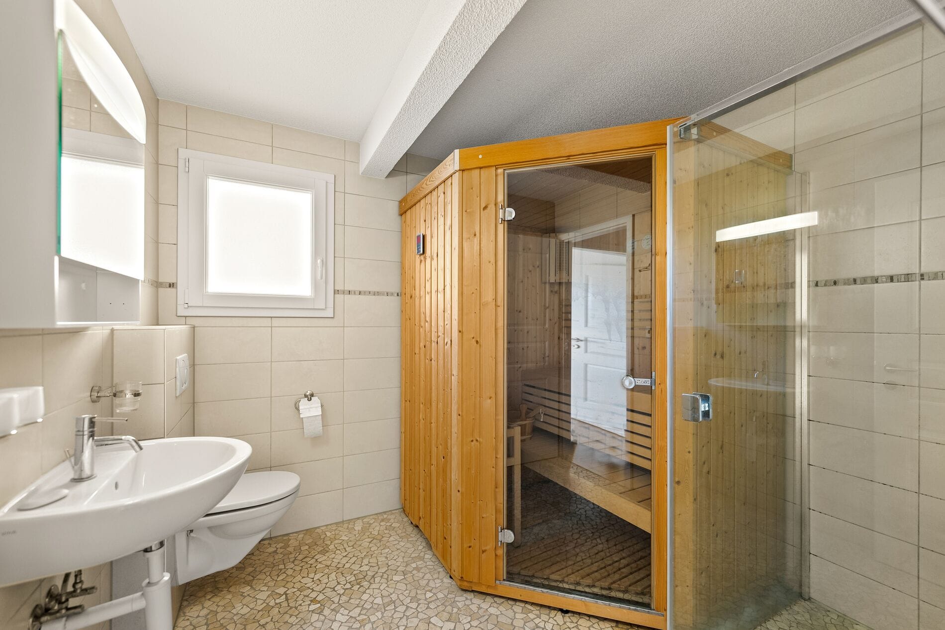 Dès l’entrée, un vaste hall dessert l’espace nuit composé de quatre belles chambres, dont deux avec accès à un balcon privatif. Ce niveau comprend également une salle de bains ainsi qu’une salle de douche équipée d’un sauna, parfait pour des moments de détente à domicile.