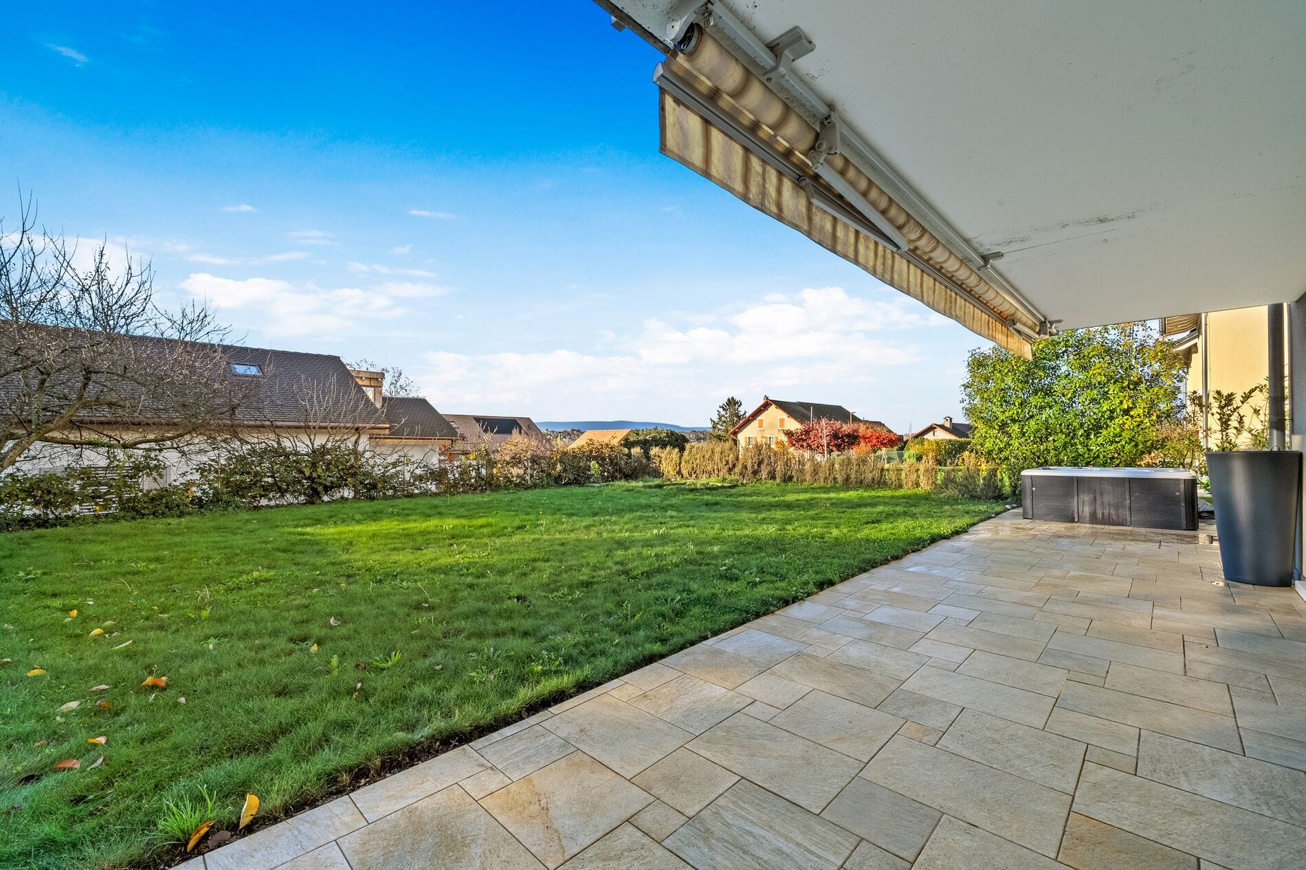 Le jardin, accessible directement depuis la cuisine et le séjour, offre un bel espace extérieur avec terrasse de plain-pied et jacuzzi, propice à la détente et aux moments en famille.